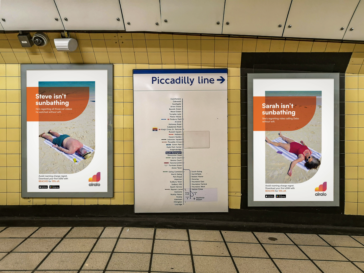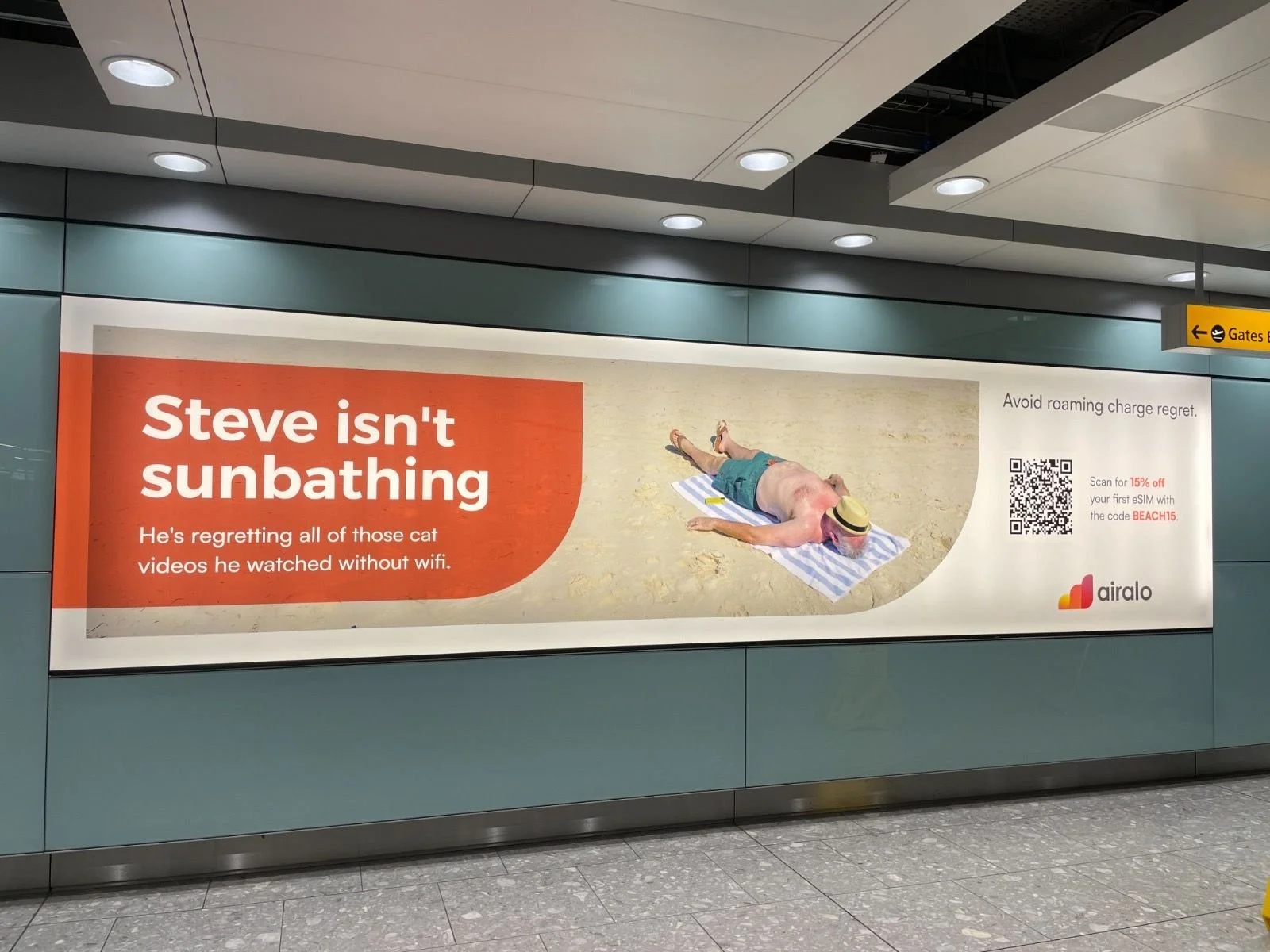 Uncharted partnered with global eSIM provider Airalo to launch a bold pan-European campaign ahead of the summer travel rush. Activated across major airports and high-impact OOH sites in the UK, Germany and Italy, the work brought roaming charge regret to life through surprising visuals, where holidaymakers look like they’re sunbathing, when they’re actually reacting to sky-high data roaming bills. A fun, memorable nudge for travellers to install Airalo before they fly.