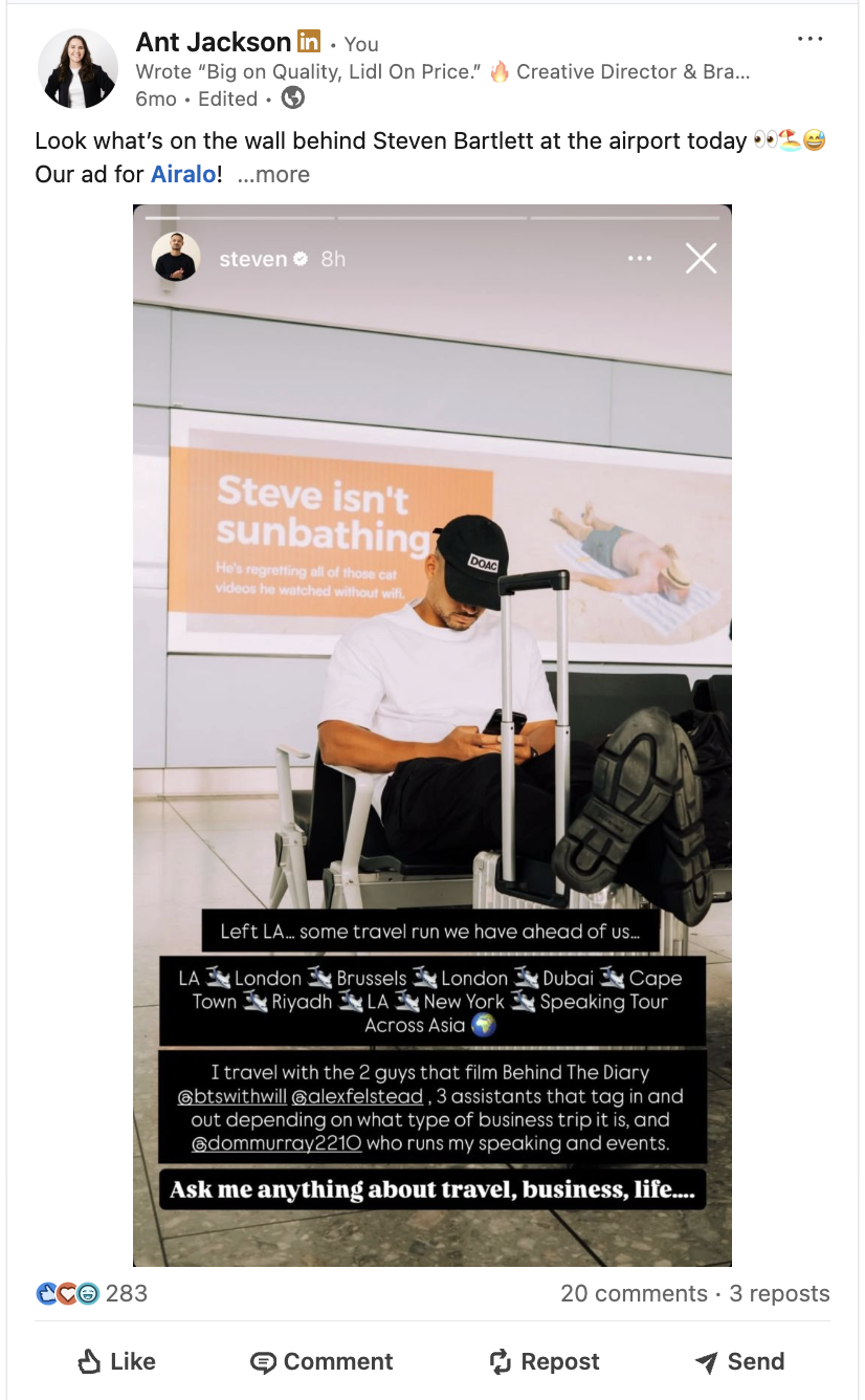 After a very successful testing phase, the campaign was rolled out across Europe. It’s been widely shared across social media, even made a guest appearance in Steven Bartlett’s Instagram stories.